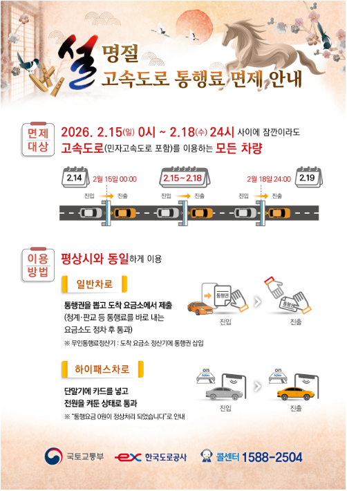 1️⃣ 2026년 설날고속도로 통행료 면제기간 일정
