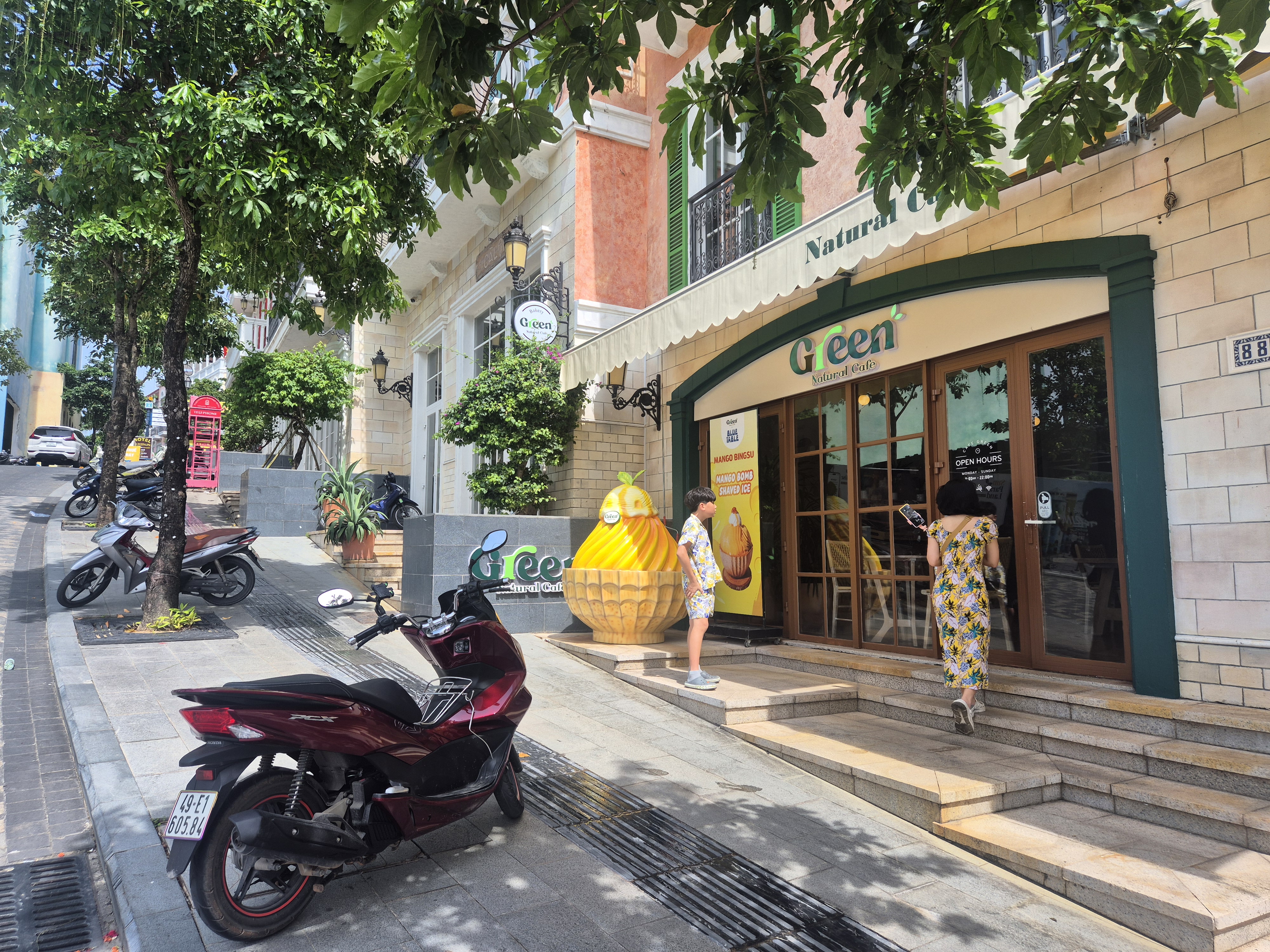 푸꾸옥 남부 썬셋 타운(Sunset Town)을 걷다 보면, 유럽풍 건물들이 줄지어 이어져 있어서 어디가 어디인지 헷갈릴 때가 많아요. 그런데 **Cafe Green(카페 그린)**은 외부 간판이 눈에 잘 띄고, 깔끔한 그린 컬러 로고 덕분에 멀리서도 한눈에 알아보기 쉬웠어요.