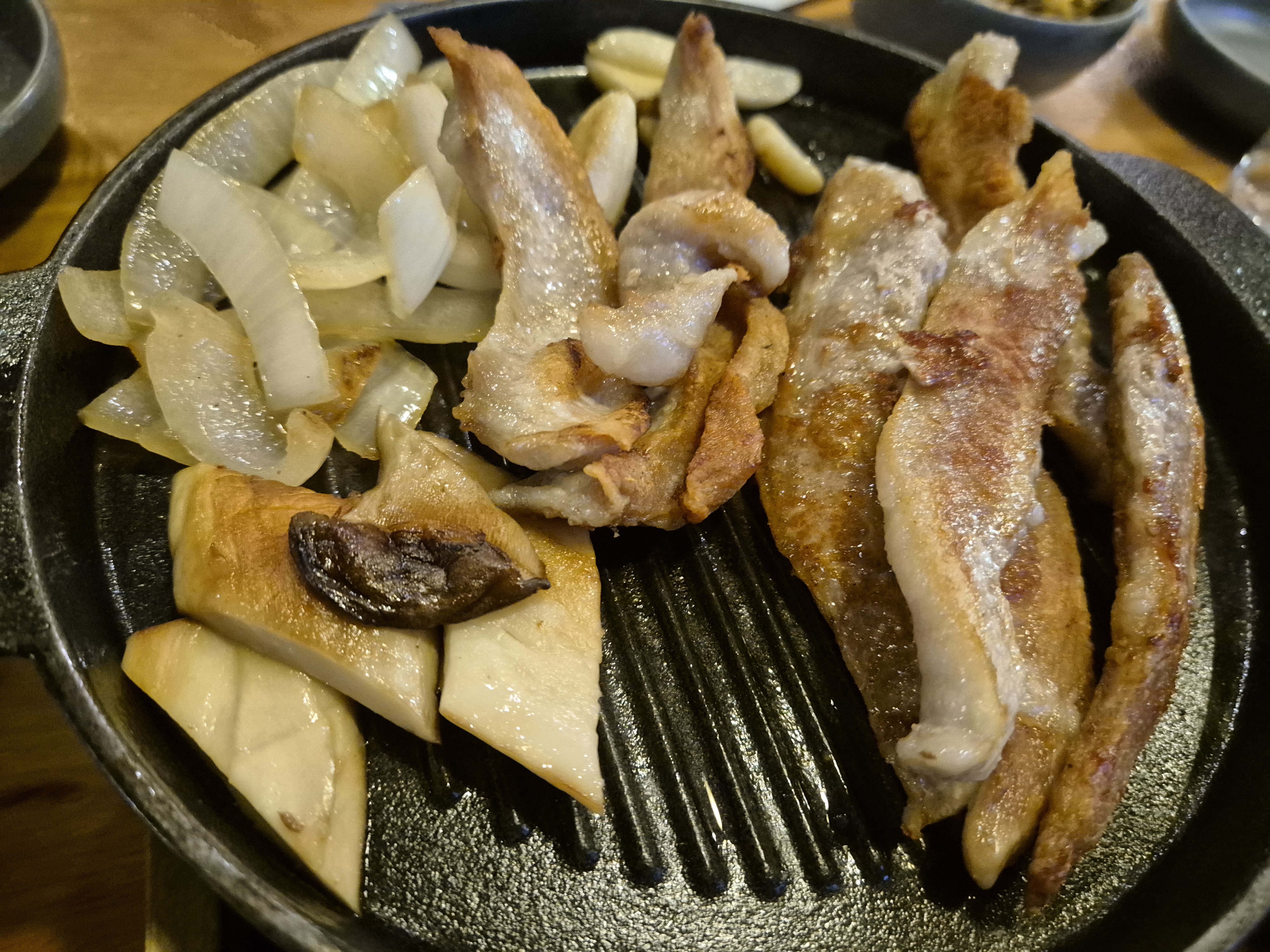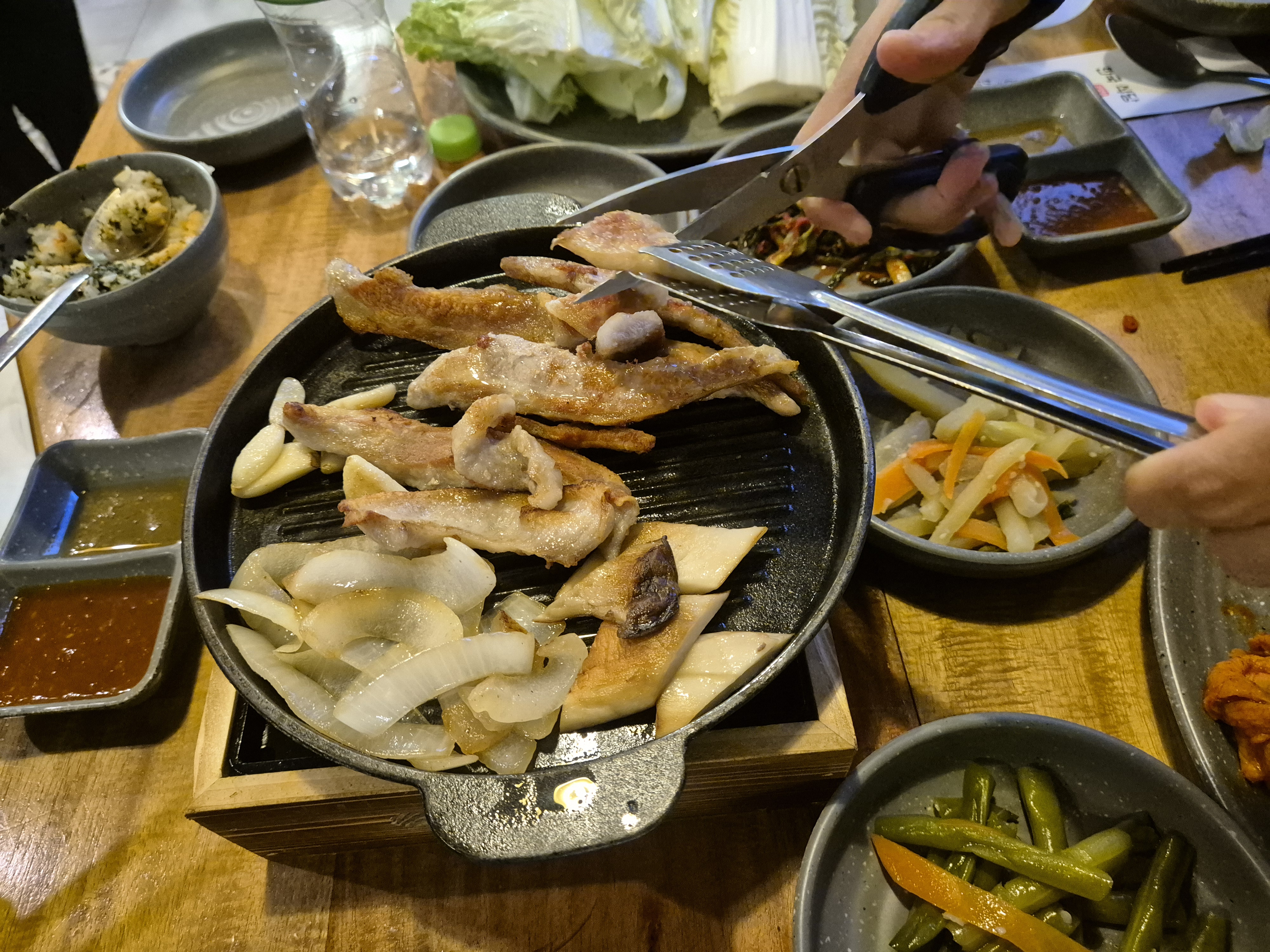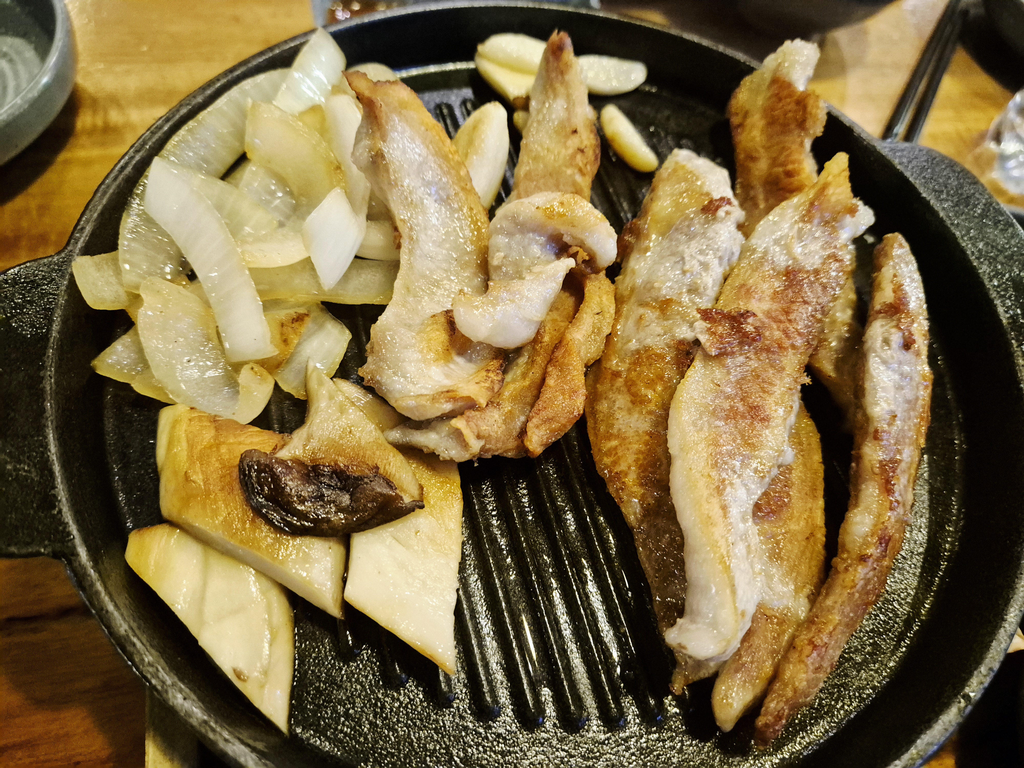 한국에서는 보통 직접 구워 먹는 삼겹살과 항정살이지만, 이곳에서는 구워서 나오는 방식이라 아쉬움은 있었습니다. 그래도 맛은 한국에서 먹는 것과 크게 다르지 않았고, 아이들이 잘 먹어줘서 전체적으로는 만족스러운 식사였습니다.