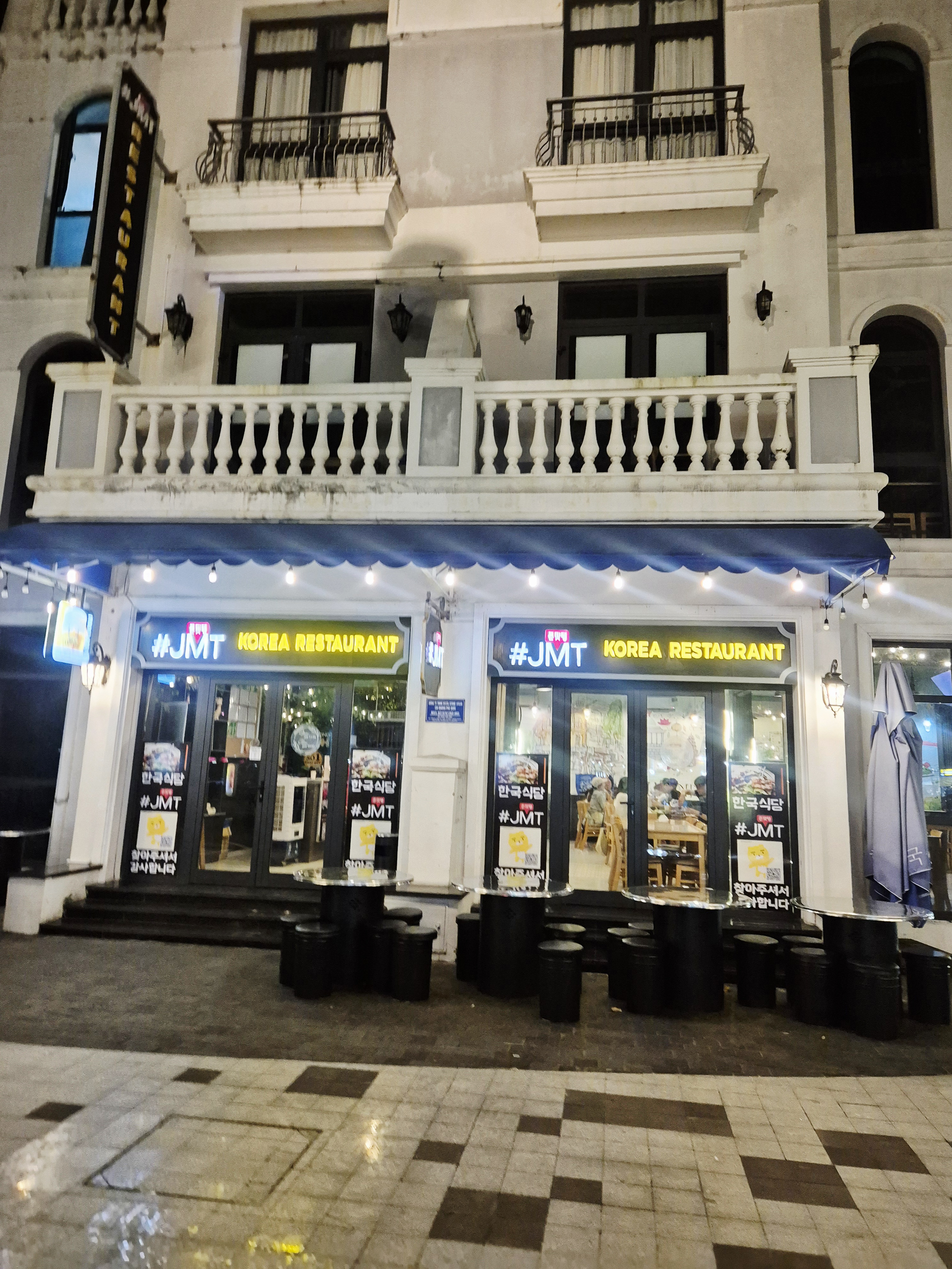 간판에는 #JMT KOREA RESTAURANT라고 크게 표시돼 있어 한식당이라는 점이 한눈에 들어옵니다. 그랜드월드는 밤에도 사람이 많은 관광지라 저녁 시간대에도 접근성이 좋고, 근처에서 식사 → 산책 일정으로 이어가기에도 편합니다.
